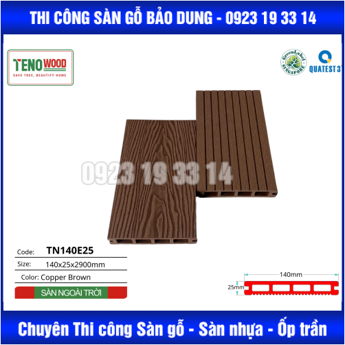 Gỗ nhựa ngoài trời là dạng vật liệu tổng hợp được sản xuất từ bột gỗ tự nhiên kết hợp với các hạt nhựa PE theo một tỉ lệ nhất định. Trong đó, gỗ nhựa composite TenoWood sử dụng công nghệ hiện đại Nhật Bản với quy trình ép đùn và phun đúc để cho ra những sản phẩm gỗ nhựa chất lượng có độ bền cao, đảm bảo tính thẩm mỹ và an toàn cho người sử dụng.